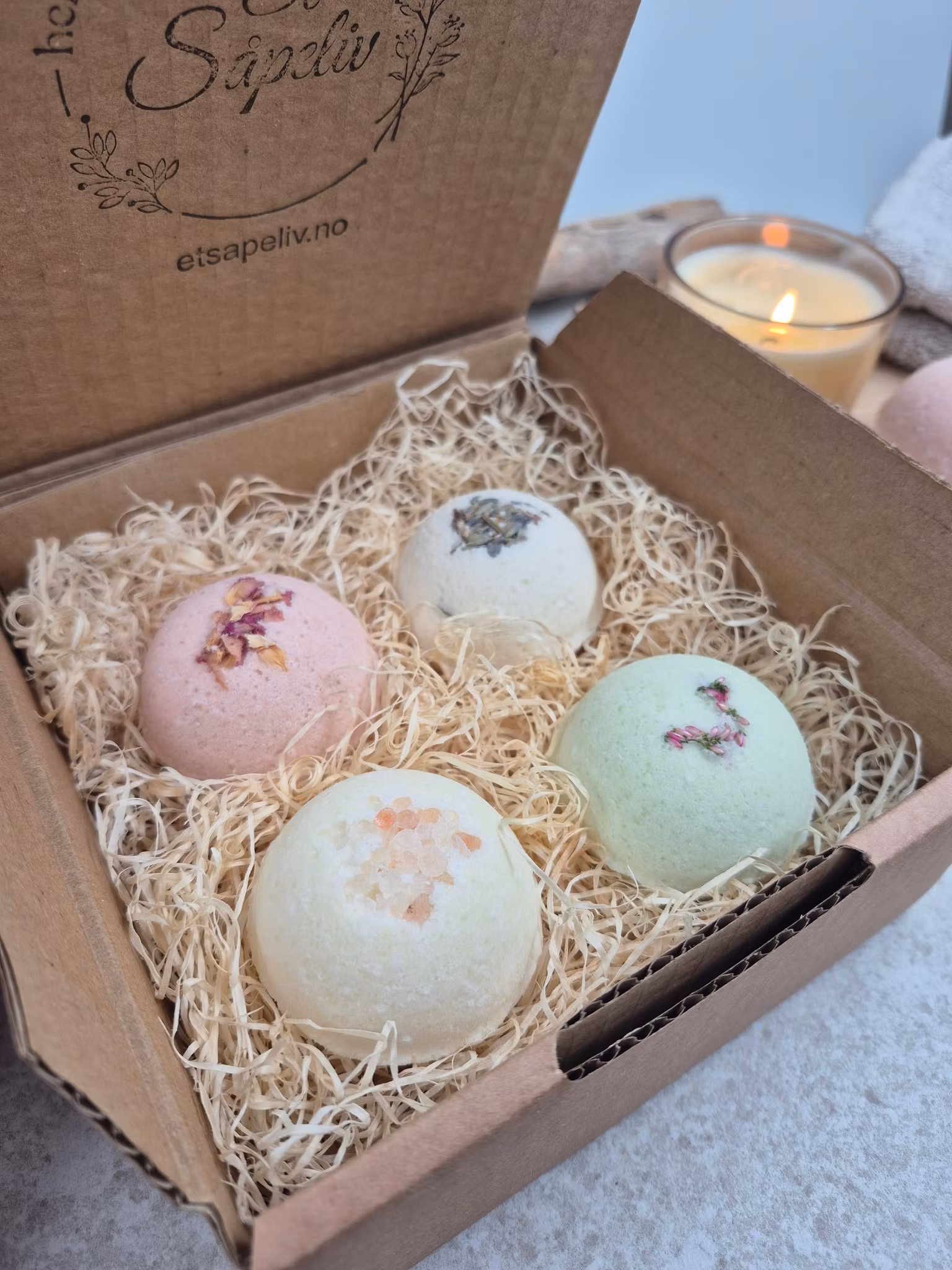 Hver badebombe er laget med pleiende jojobaolje, epsomsalt og