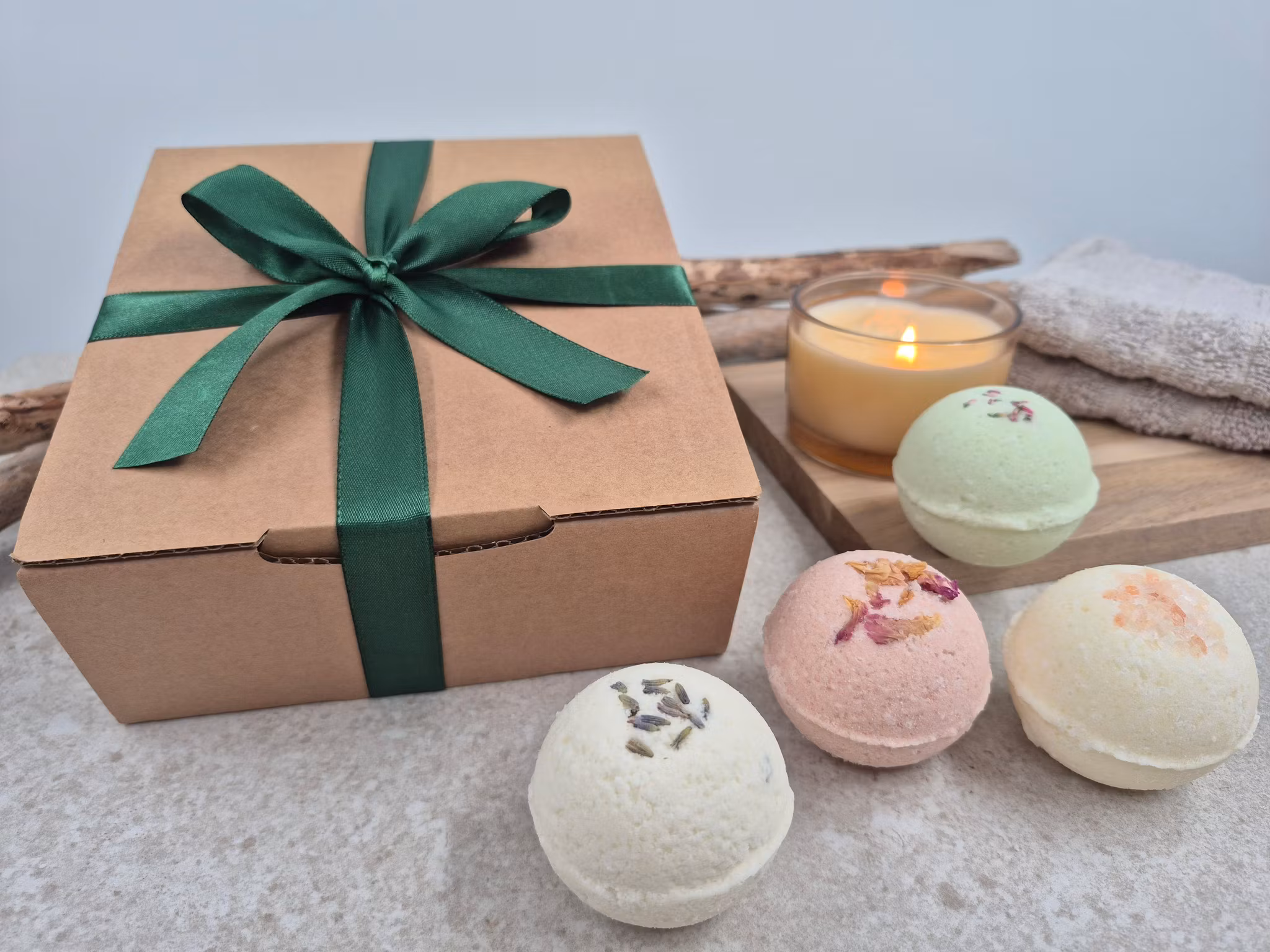 Gi bort øyeblikk av ro og velvære! Denne vakre gaveboksen inneholder alle våre fire håndlagde, naturlige badebomber: