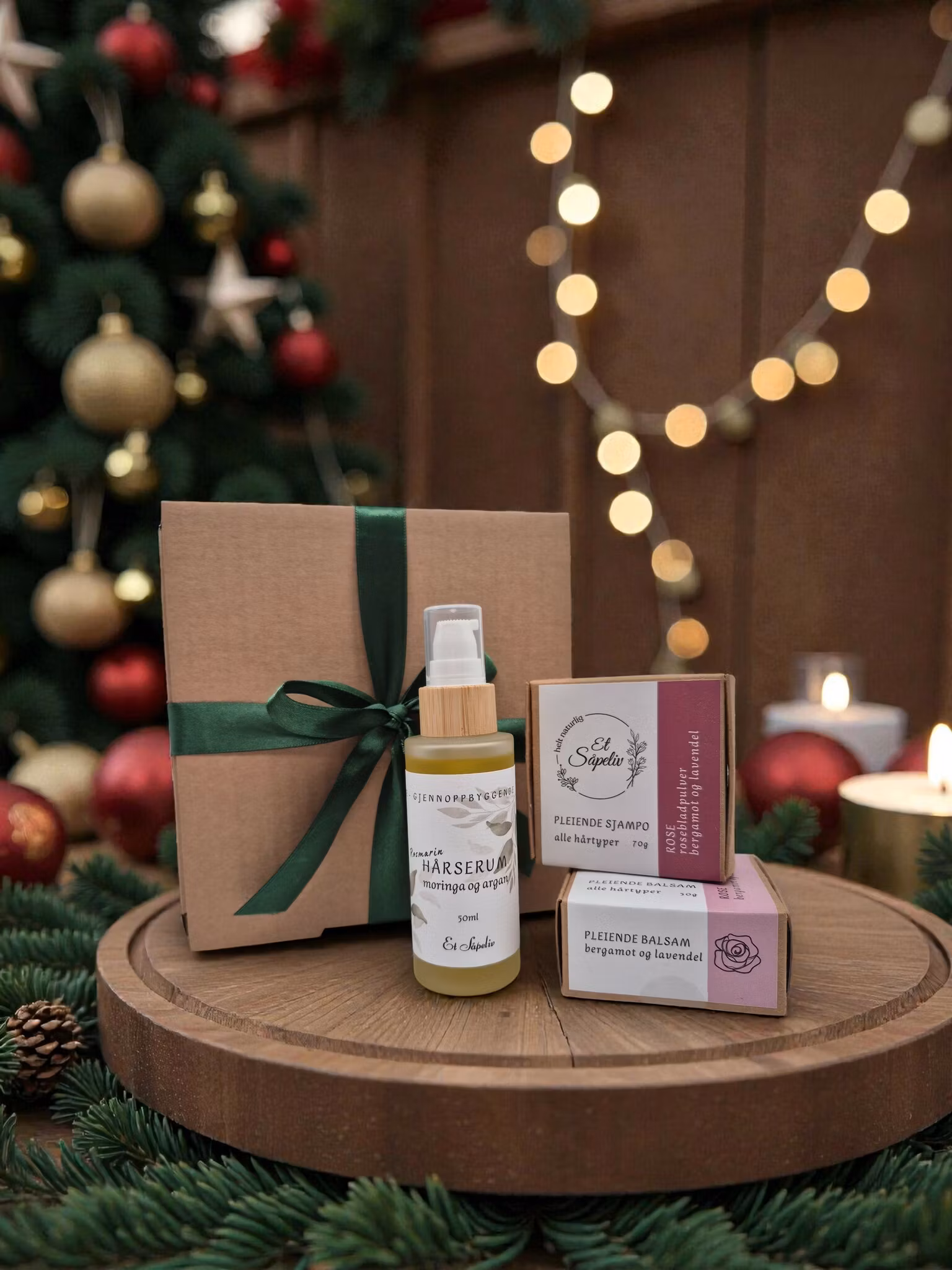 Alle produktene er håndlaget med rene, naturlige ingredienser og passer for alle hårtyper. Gaveesken er ferdigpakket og klar til å gi – en gjennomtenkt gave som gir både velvære og pleie.