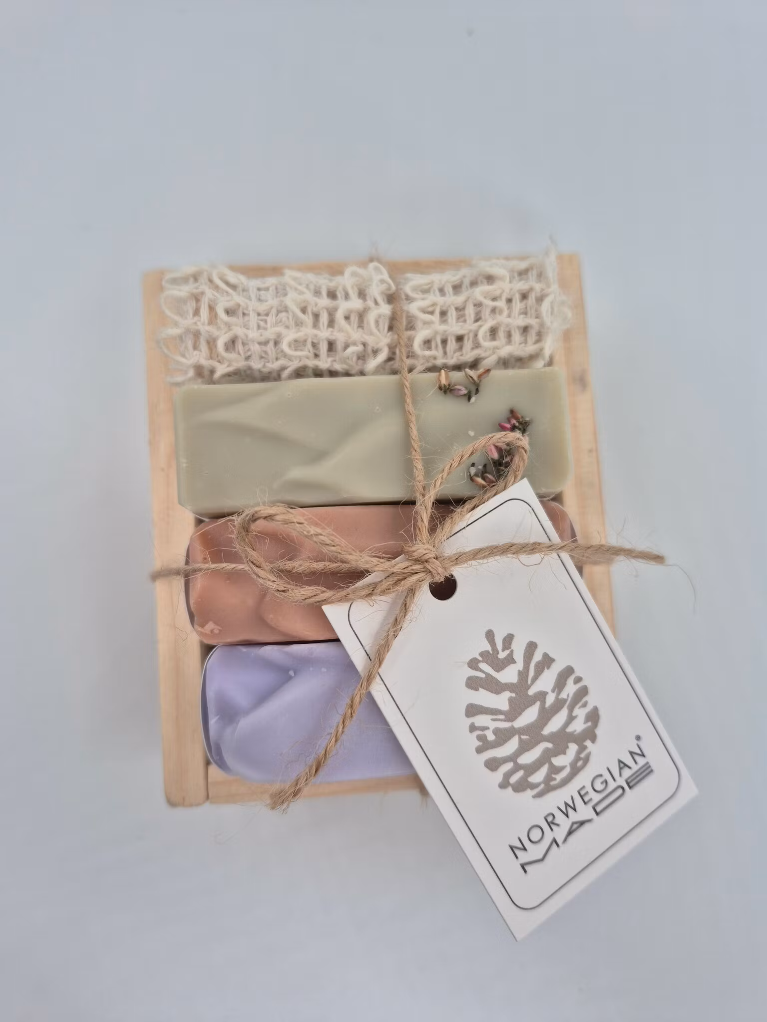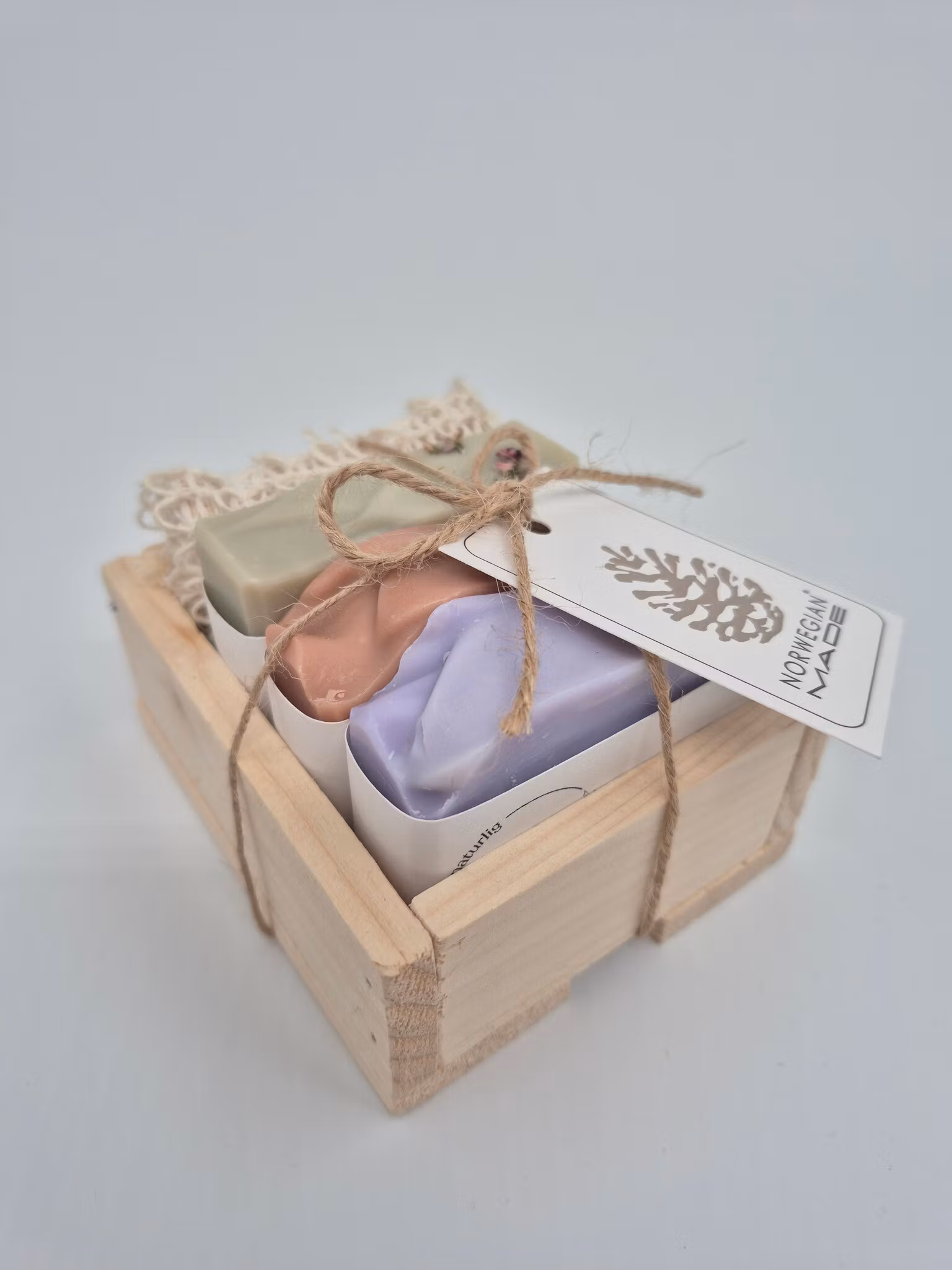 En liten, gjennomtenkt gave som gleder hud og sanser. Settet inneholder:Tre valgfrie, håndlagde såper – skånsomme, milde og med naturlige ingredienser som etter